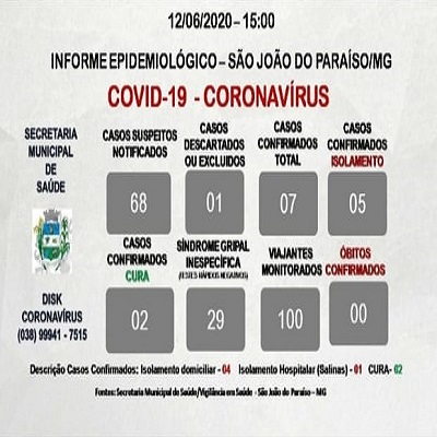 | 07/07/2020 Novos casos de covid em São João do Paraíso | ||