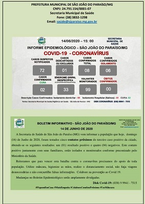 ![]() | 14/06/2020 Informe Epidemiológico de São João Paraíso MG 14/06/2020 | |